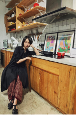 身穿一件黑色宽松款的半袖衬衣,自嘲的讲着自己的裤子是在楼下花了50元买的大妈裤,脚踩着一双感觉像西部牛仔风的靴子,看似混搭起来的衣服却被她穿出了另一种都市慵懒风的感觉。这么一个个性爽朗的女生,身上散发出那种文艺女青年的气息,让小编看醉了。
