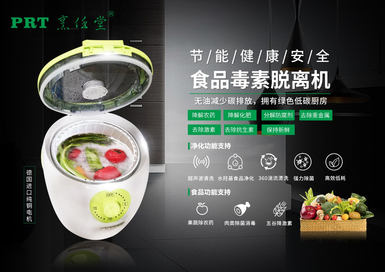 烹任堂自主研发的“食品毒素脱离机”,工作时无需添加任何洗涤剂或消毒液。只需轻轻旋转一下定时器,涡流喷淋式水流和臭氧氧化分解等的多重作用,自动完成清洗、降解农药、杀菌、解毒等工作,而且产生的臭氧在空气中会很快还原为氧气,不会造成二次污染,洗涤更健康。