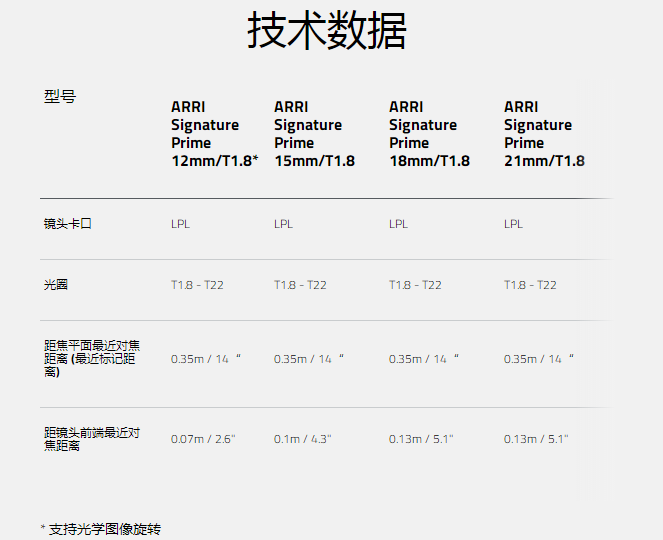 ARRI Signature Prime是业界第一套专门针对数字电影摄影机而开发的焦段覆盖完整的大画幅镜头,以温暖柔和的肤色呈现、非凡的散焦品质和精致眩光闻名。Signature Prime是目前焦段最完整的大画幅镜头系列,总共16支镜头,从12 mm一直延伸到280 mm焦段。它们的成像圈最大46 mm,覆盖了所有影像传感器,只要是LPL卡口机型,无论是ARRI或第三方品牌的摄影机,都可以使用这套镜头。