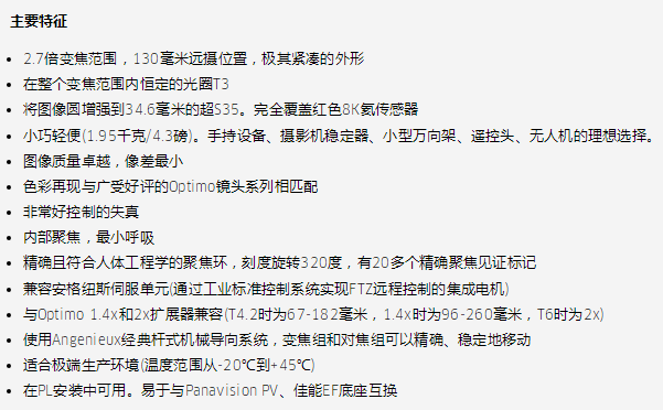 48-130 T3是16-40 T2.8和30-76 T2.8 Optimo Style短变焦的互补变焦镜头。48-130 Optimo Style具有2.7倍的变焦范围、130毫米的长焦距和T3的快速光圈,是纪录片、野生动物、采访和特写等广泛应用的理想镜头。48-130具有出色的光学性能、出色的图像覆盖范围(Ultra S35格式,最高可达34.6毫米图像圆)、最小的呼吸和无斜坡的T3快速光圈,是拍摄高端数字产品的绝佳伴侣。它的重量轻、体积小,安装在最新的S35数码相机上时,为肩部工作提供了完美的平衡。48-130与其他Optimo Style短变焦镜头具有相同的坚固和精确的机械结构,使其成为在挑战性环境中拍摄时值得信赖的工具。使用这种额外的镜头,Optimo Style短变焦镜头使用2倍扩展器,焦距范围为16毫米至260毫米。这种经济实惠的包装可以与25-250 Optimo风格相结合,用于特定的三脚架工作。