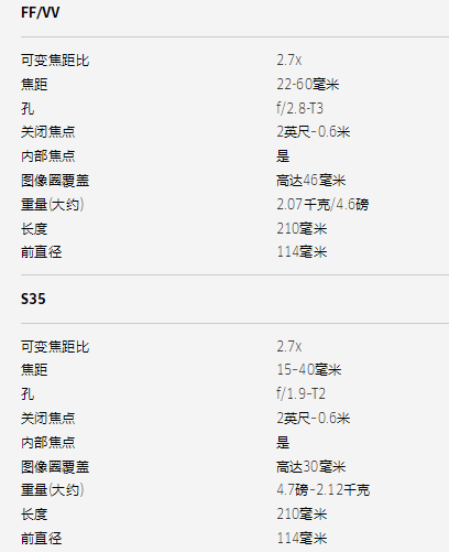 22-60毫米T3 / f2.8,FF/VV图像覆盖最大对角线46毫米,15-40毫米T2 / f1.9,S35图像覆盖最大对角线30毫米