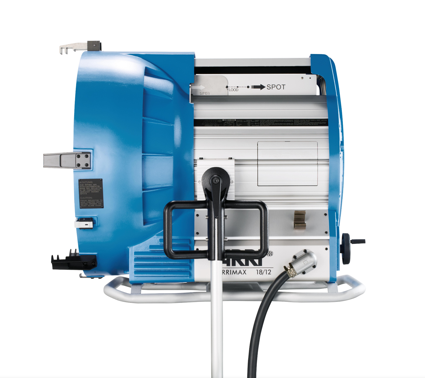 两种灯座都安全且方便 18/12 kW、18,000 W 单端灯使用更坚固的 GX51 灯座,ARRI 工程师为此设计了一种特殊灯座,可减轻来自灯针的机械应力,现在仅用作电气连接。 灯夹紧机构是自动对准的,并使用坚固的嵌入式灯锁手柄。 为确保工作人员可以轻松使用 12,000 W 灯或带 G38 灯座的 18,000 W 单端灯版本,新灯座接受任何一种灯类型,无需修改或调整。