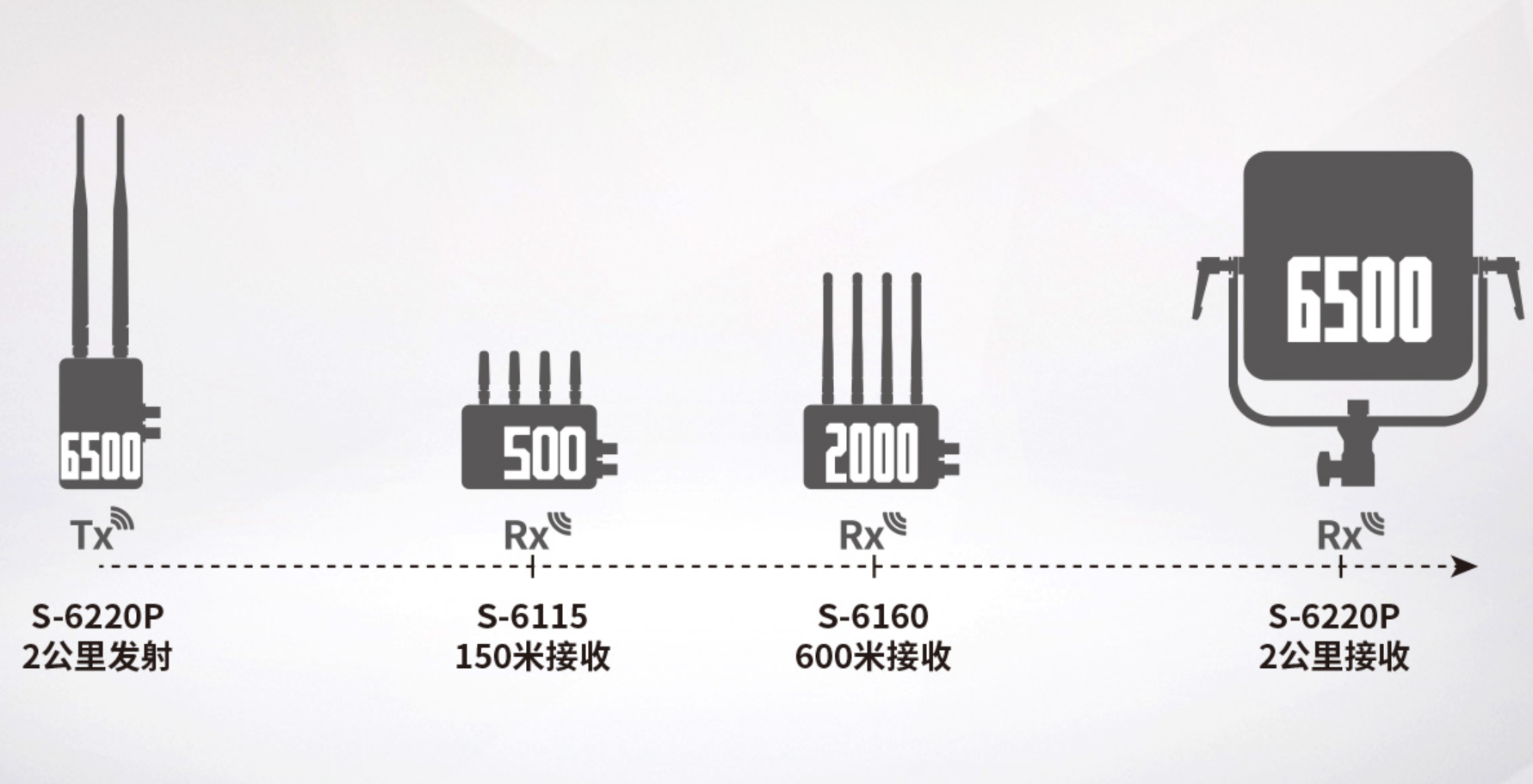 使用S-6230P 3000米发射端,可以在150米距离内使用S-6115接收端、在600米距离内使用S-6160接收端、在2000米距离内使用S-6220P平板接收端、在3000米距离内使用S-6230P平板接收端同时接收信号。